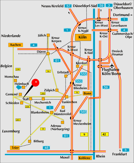 Bei der Anbindung an den internationalen Luftverkehr lässt die Nordeifel überraschenderweise München deutlich hinter sich. Die Fahrstrecke vom Haus Wackerberg bis zum Terminal 1 des Flughafens Köln/Bonn Konrad-Adenauer ist locker in 50 min. zu schaffen – aus der Münchner Innenstadt zum Franz-Josef-Strauß Airport kann das schwierig werden.